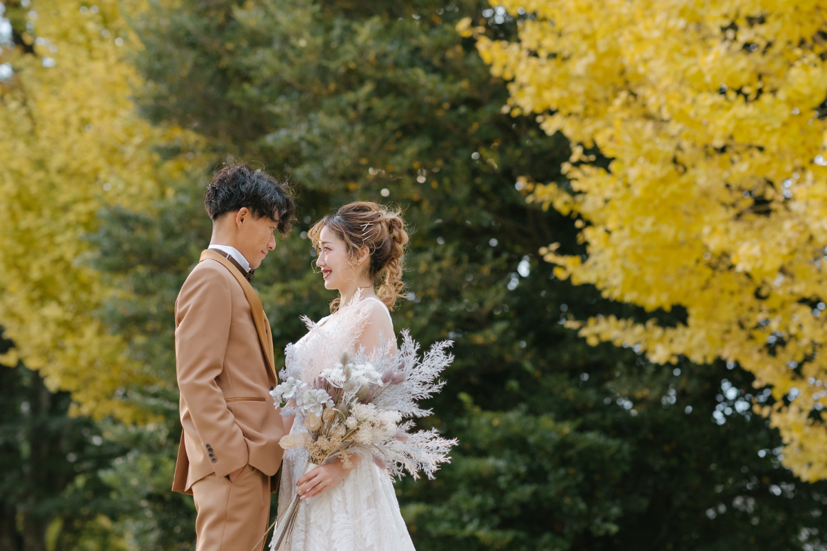 落ち葉を活かした足元ショットや、色づいた木々を背景にしたツーショットは季節感たっぷり。