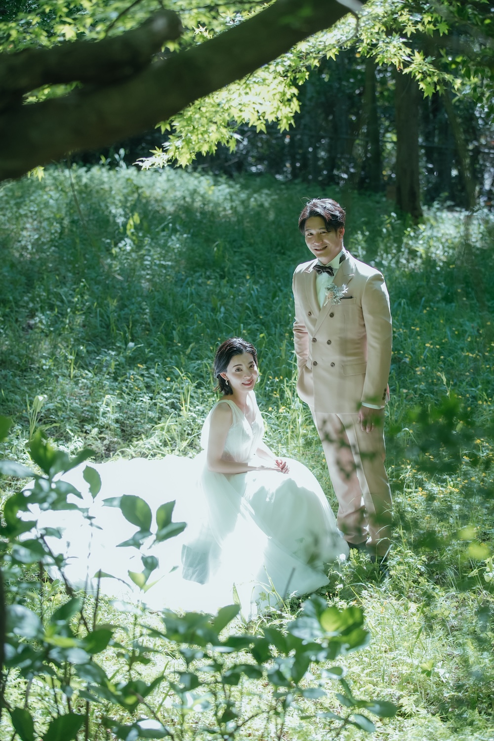 公園内にある藤棚は、薄紫の花が房状に垂れ下がり幻想的な雰囲気を演出。透き通る初夏の光と藤の香りに包まれた撮影は、爽やかで気品ある仕上がりに。