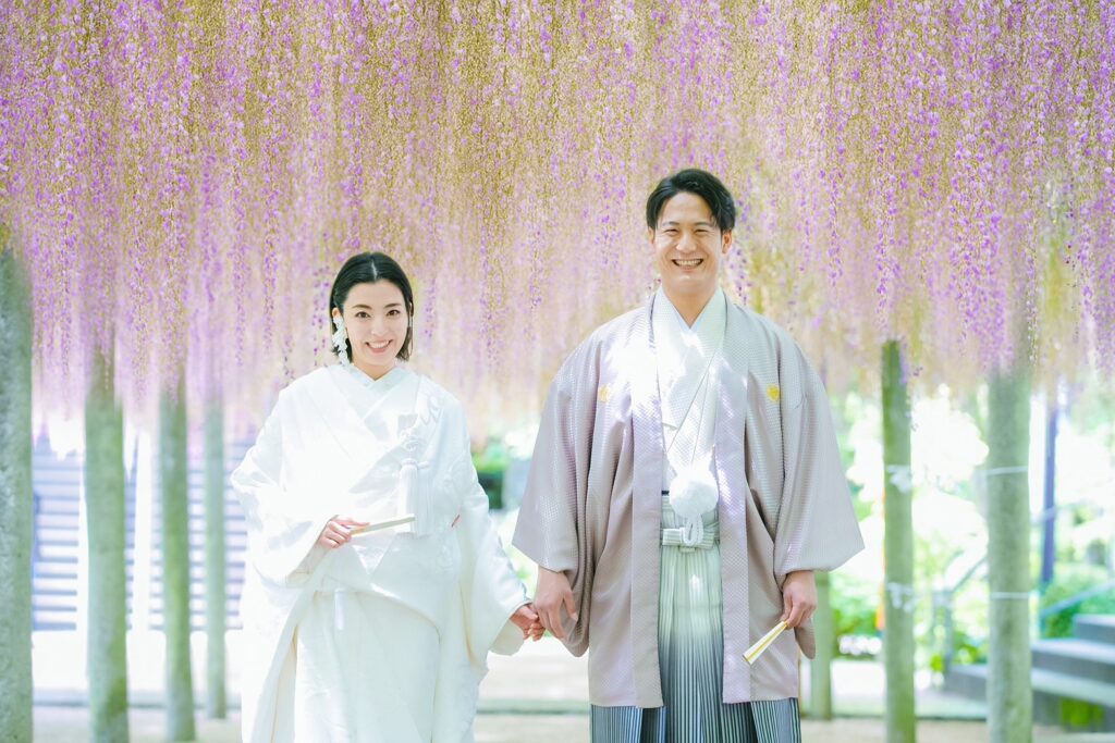 藤の花越しに撮影すると、ふんわりとした色合いがドレスや和装を優しく引き立てます。