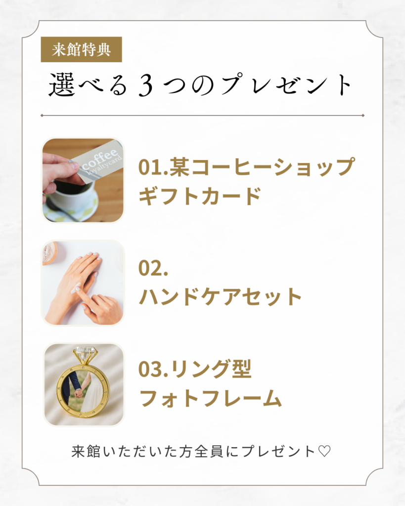 ヘアメイク後にドレスをお召しいただきますので、当日は着替えやすいよう前開きのお洋服でお越しくださいませ。